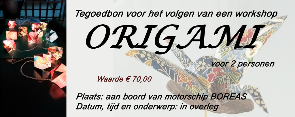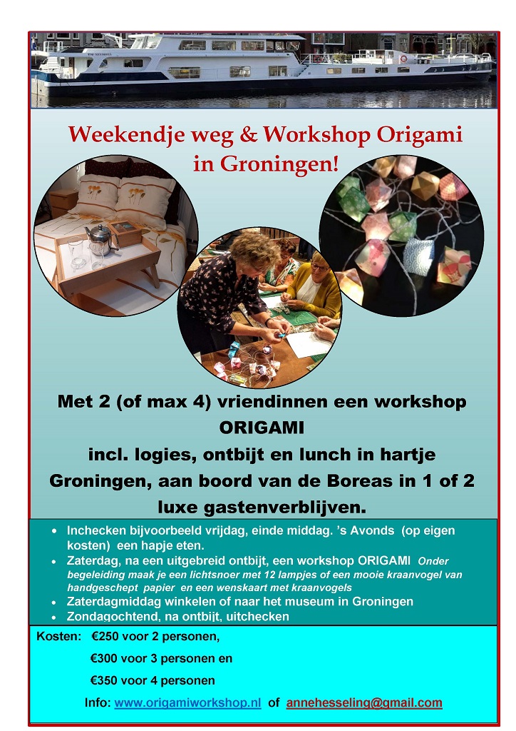 Met maximaal 8 personen kun je aan boord van de Boreas een workshop origami volgen. Voor grotere groepen kan een andere locatie worden gezocht óf ik kom naar je/jullie toe!