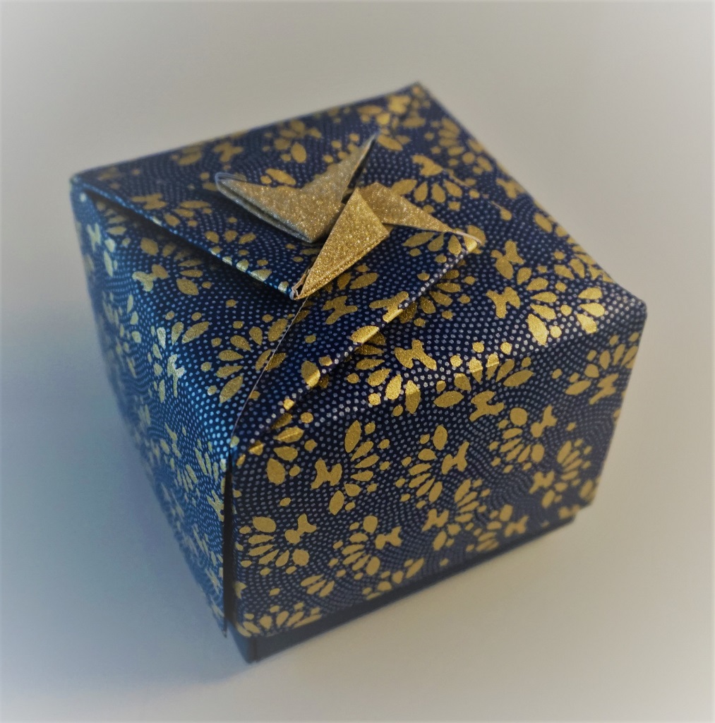 We maken een doosje met een deksel gemaakt uit 4 vellen handgeschept Chiyogami papier van elk 15 x 15 cm. De onderkant wordt gevouwen van papier met een linnen structuur in een bijpassende kleur. Het doosje wordt 8 x 8 x 6 cm. Zowel deksel als bakje bestaan uit elk 4 vouwsels.